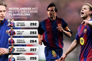 德容为巴萨292次出场,追平科库并列队史荷兰球员纪录